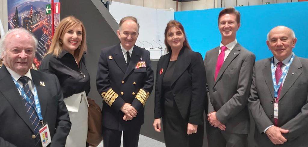 Daniela Otero, CEO of Skål International, and Mr. Juan Francisco Martínez Núñez, President of the 'National Commission for the commemoration of the V Centenary of the first Fernando de Magallanes and Juan Sebastián Elcano round-the-world expedition', with Skål International Spain representatives during Fitur 2020.