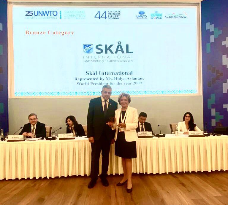Hulya Aslantas, President Skål International 2009 and current representative of Skål International to UNWTO, received the award on behalf of the organization during the award ceremony that has taken place on 16 October 2023 in the 44th UNWTO Affiliate Members Plenary Session, during the 25th session of the UNWTO General Assembly in Samarkand, Uzbekistan.